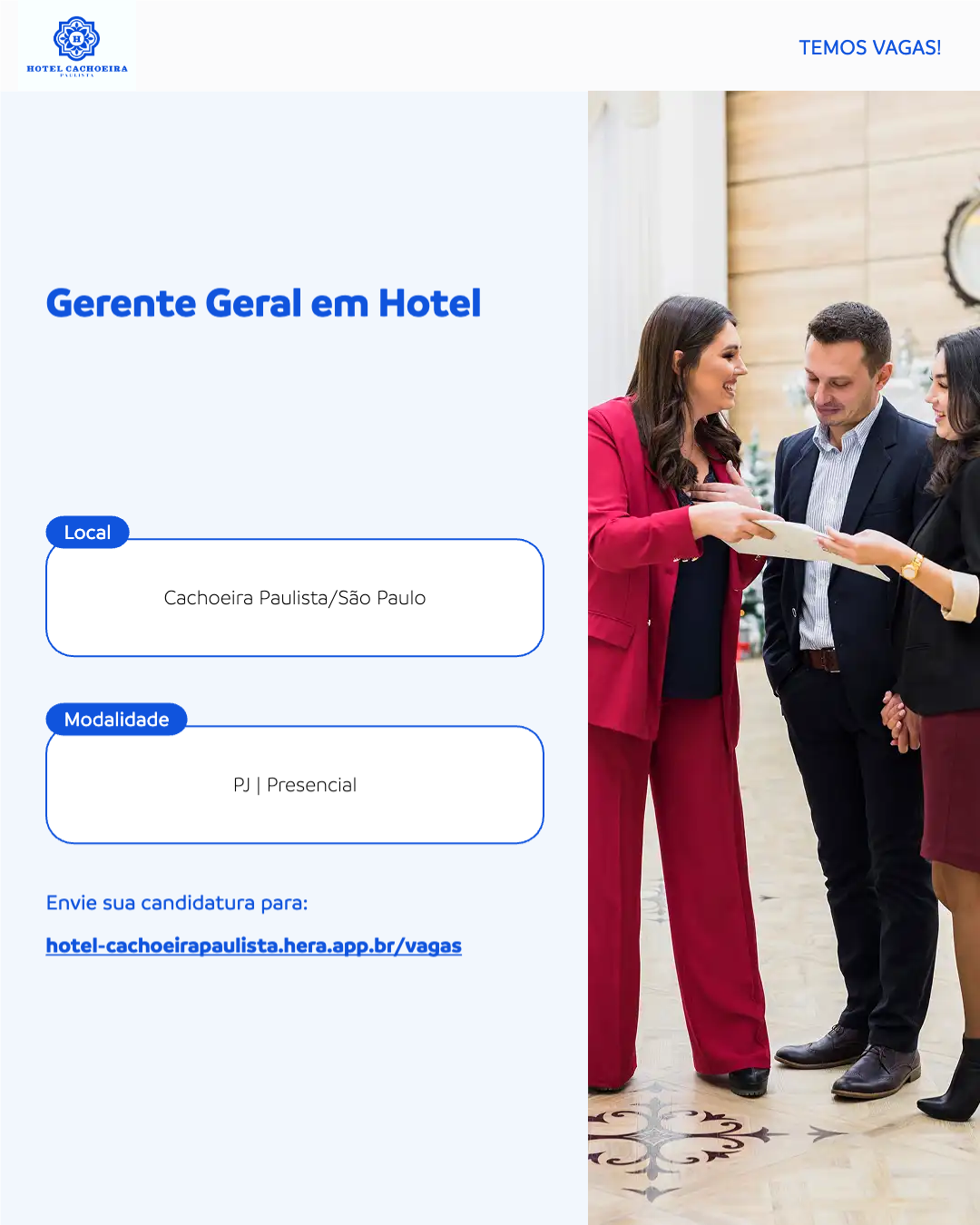 Buscamos uma Gerente de Hotelaria para liderar a operação de hospedagem e A&B a fim de garantir excelência em atendimento, gestão e experiência do hóspede.